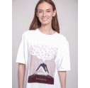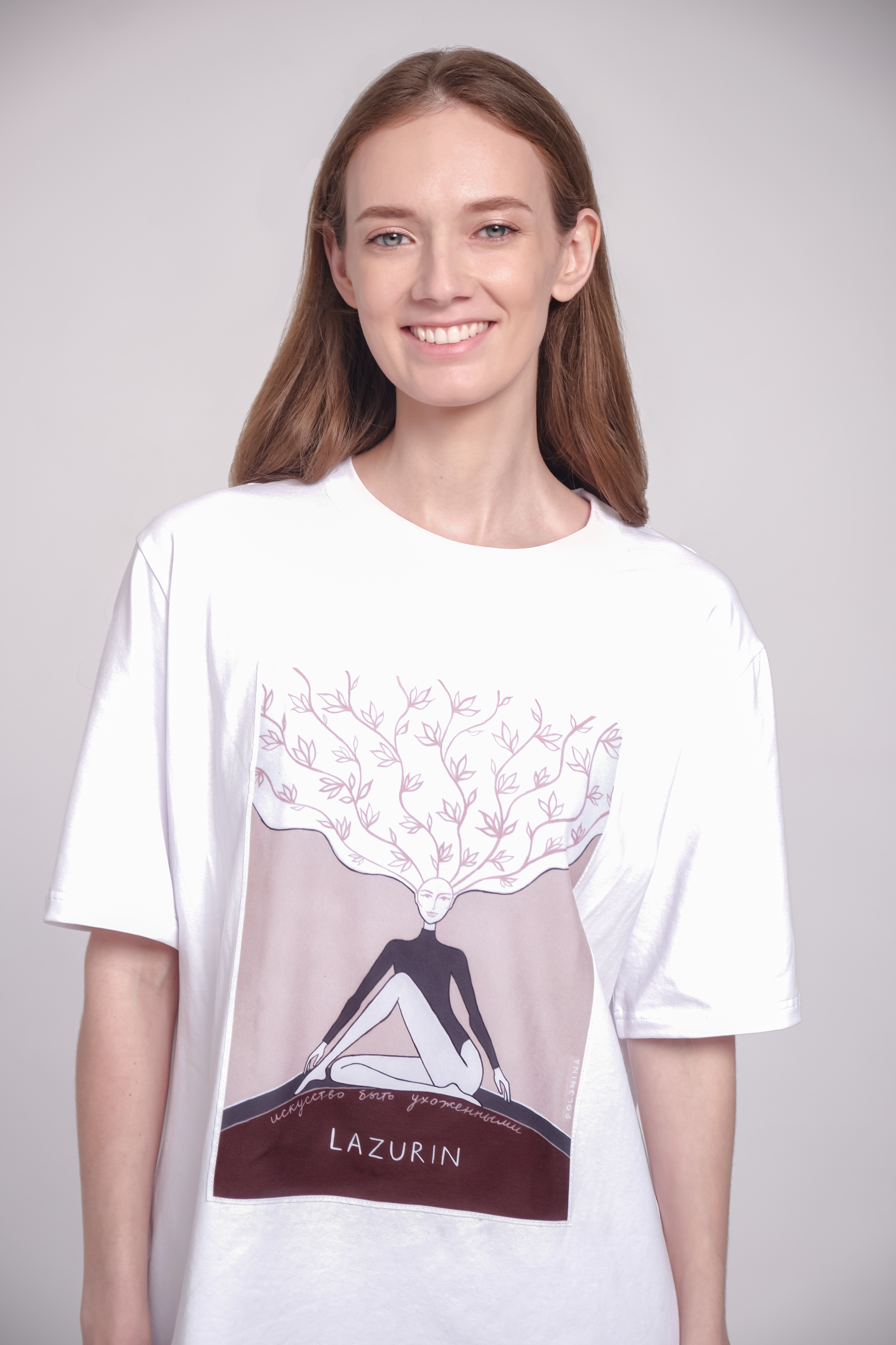Фирменная футболка от бренда LAZURIN разработанная совместно с фэшн дизайнером Настей Полуниной. Посыл, который заложен в данном принте: "На принте изображена Муза, которая заботиться о себе и использует синергию с природой и природной женской силой. Акцент сделан на волосах как одном из якорных символов красоты и природности. Муза сидит устойчиво на земле, что олицетворяет ее связь с Матерью природой и ее внутреннюю силу". Принт напечатан на искусственном шелке и пришит к изделию. Футболка изготовлена из мягкого и плотного хлопка.